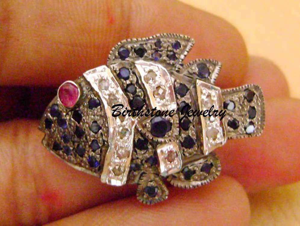 Antique Rose Cut Diamond 0.44ct 925 Silver Ruby Sapphire Fish Design Beautiful Ring